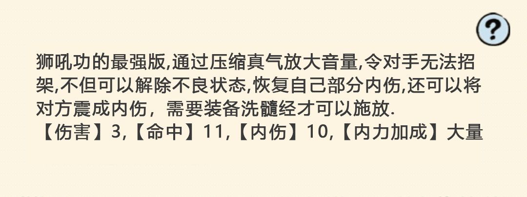 【大号狮吼功+】:远程带伤害辅助类绝招,伤害一般。无需内力比拼,释放后可清除自身大部分负面状态和敌方可驱散的正面状态,并给敌方添加负面状态“颤抖”,同时给自身添加2回合“回春”效果,恢复内伤及少量生命值。