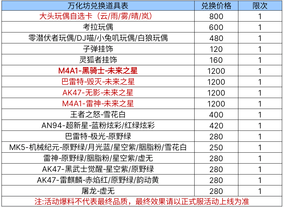 万化坊兑换活动将在8月3日上线,请大家前往“限时活动”参与。为了帮大家节省流量和时间,咱们直接奉上万化坊兑换表,请大家自行预览各道具所需的万化币数量以及兑换上限。
