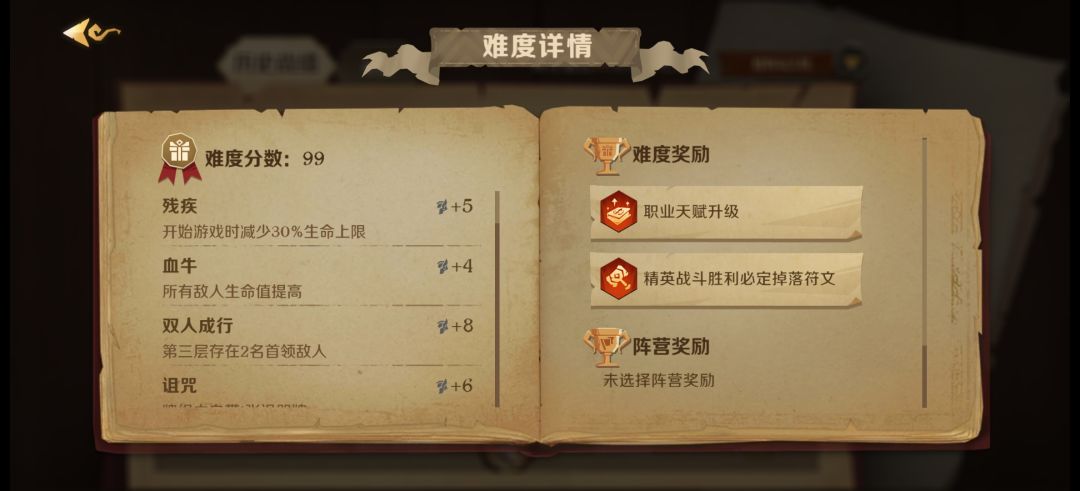难度奖励选择职业天赋升级和精英战斗必定掉落符文。