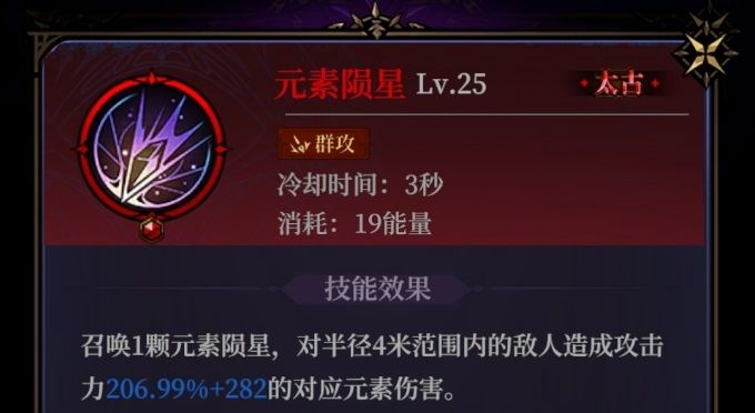 元素陨星:各系法师的后期选择之一,升阶后的不仅能给自身增加各类不同的增益buff效果,还能提高伤害效果(如果你现在正犹豫不决时,选择它不一定是最优解,但一定是最合适)