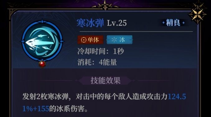 寒冰弹:寒冰法师的前期选择,后续升阶后不仅有几率可以给敌人增加寒气的debuff效果,还能分裂攻击,额外造成伤害