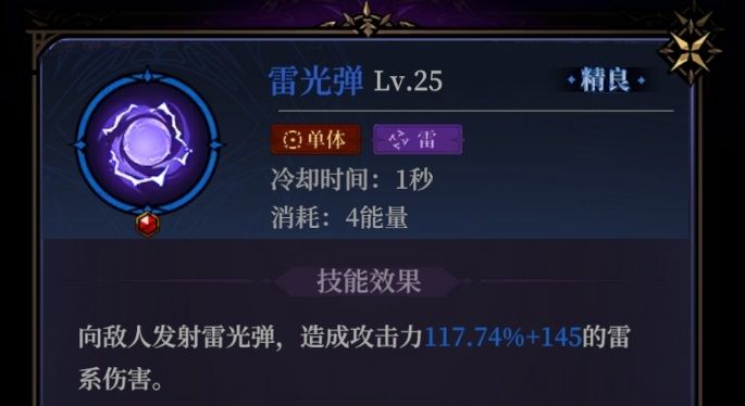雷光弹:雷电法师的前期选择,后续升阶后的效果也较为强大,不仅有几率给敌人增加弱雷的buff效果,还能增加伤害次数