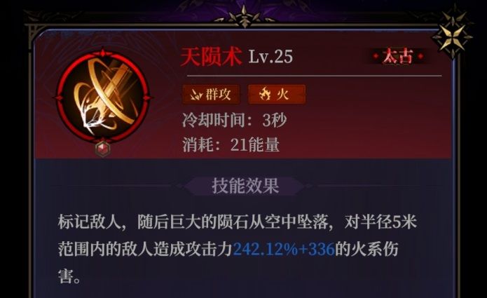 天陨术:火系法师后期选择的不二之选,升阶后不仅能提供额外的伤害,还能提升技能的伤害效果。全身写满了火系伤害🔥的技能,不愧天陨二字