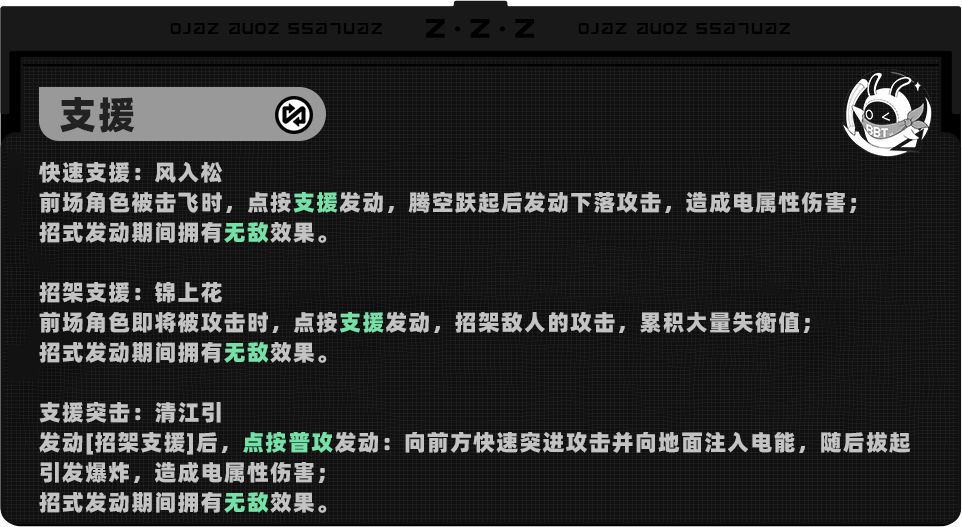 与大部分击破角色招架支援作用相近,没有特殊机制,不过青衣的招架支援失衡倍率在目前所有击破角色中最高,有可观的失衡值累计。