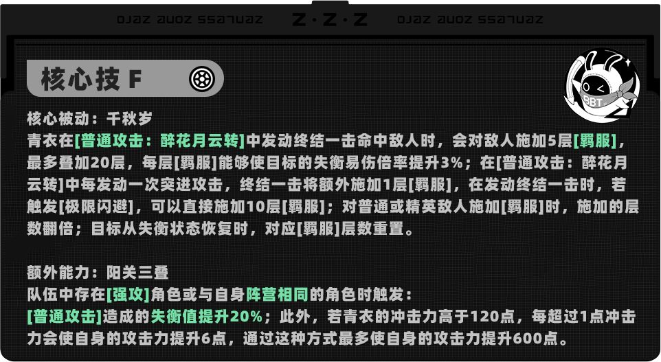 额外能力使青衣与【强攻】或【同阵营】角色组队时,能够通过冲击力来提高自身攻击力,是目前唯一的冲击力转模,能够保证击破角色自身的伤害,为后续影画强化自身输出补足攻击区数值。