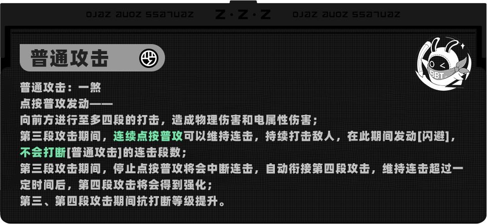 青衣第三段普攻能够通过持续点按普攻键来延长(详见普攻动图),并持续对周围造成电属性伤害,是「闪络」值堆叠的核心来源。