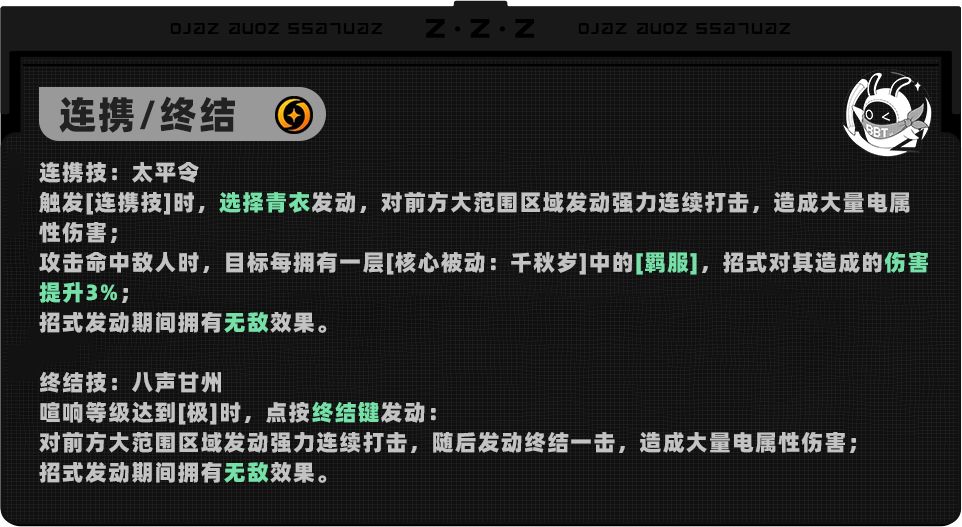 青衣的终结/连携技与其他击破角色类似,不过青衣比起他们有核心技的冲击力转模补充攻击力,且能够通过「羁服」层数提高连携技的伤害,有向副C方向培养的绳匠们可以考虑升级。