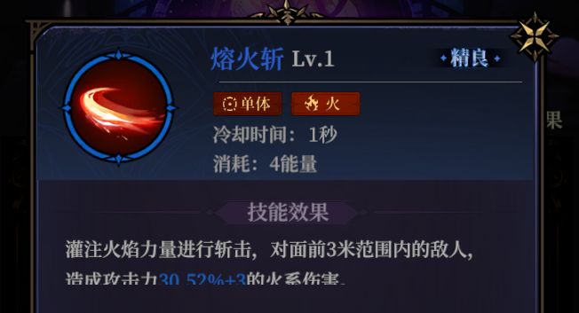 熔火斩:火系战士的前期选择,升阶后不仅能附带额外火系伤害的刀光,还能添加聚焰效果,使其火系伤害更高。