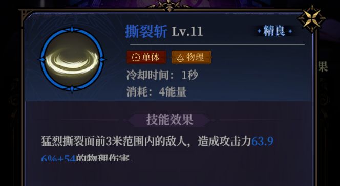 撕裂斩:物理系战士的前期选择,升阶后不仅能附带额外物理伤害的刀光,还能添加撕裂的debuff效果,使其物理伤害更高。