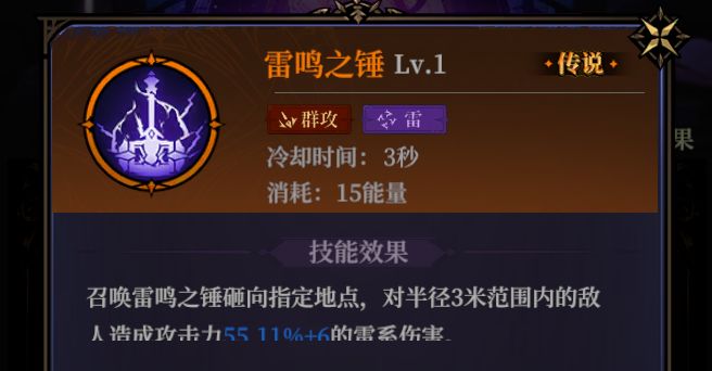 雷鸣之锤:雷系战士的后期选择,升阶后不仅能做到技能自增伤,还能施加疾风debuf效果,使其增加攻速甚至缩短技能冷却效果;(建议搭配其他能增加弱雷/感电等buff效果的技能使用,效果极佳)