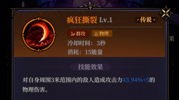 疯狂撕裂:物理战士的后期选择,升阶后不仅能增加额外伤害还能施加撕裂等一系列的debuff效果,而且还能提高技能伤害,最高阶甚至还能减少其他法术的冷却时间,极为全面。