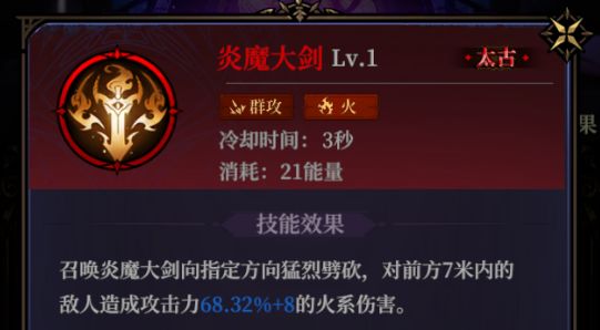 炎魔大剑:火系战士的后期选择,升阶后不仅能额外增加火海的范围伤害,还能针对于点燃的debuff有额外的伤害提升,搭配其他能增加聚焰级点燃效果的火系技能,效果极佳。