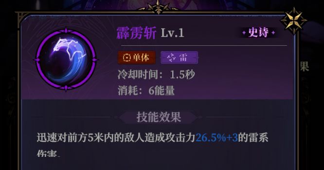 霹雳斩:雷系战士的中期选择,升阶后的效果也很强大;(建议有二阶技能后的使用效果更好,或者跟雷系技能一齐搭配使用)