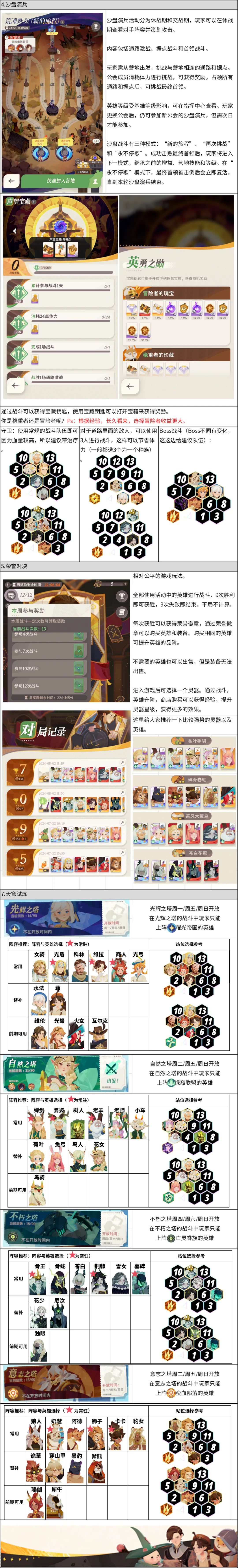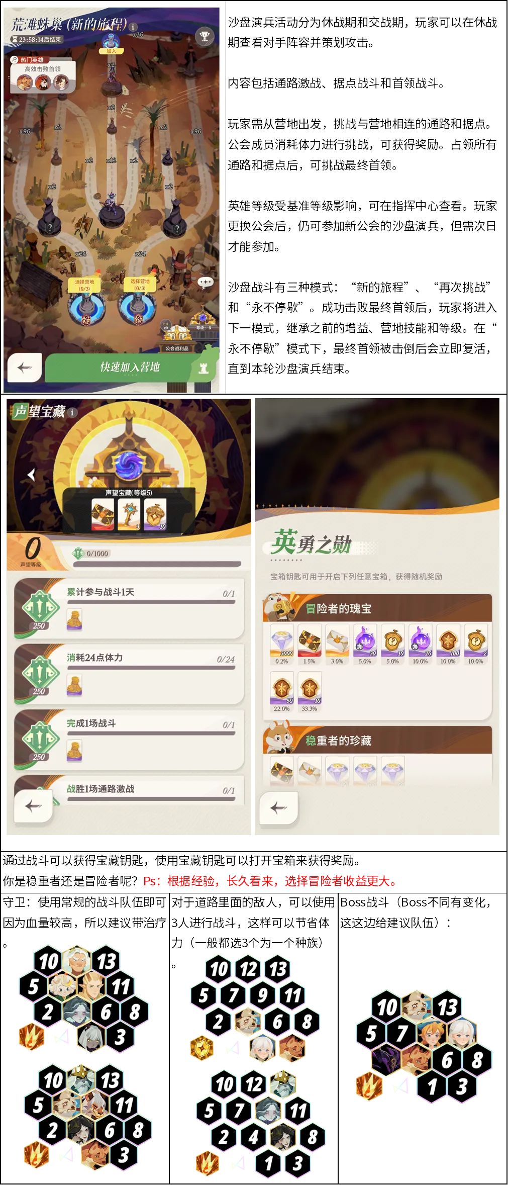沙盘演兵活动设有休战期和交战期两个阶段玩家需从营地出发,对沙盘上与营地相连的通路和据点发动挑战。公会成员消耗体力进行通路和据点的挑战,将获得相应奖励,如金币、宝藏钥匙等。宝藏钥匙可开启"英勇之勋"。