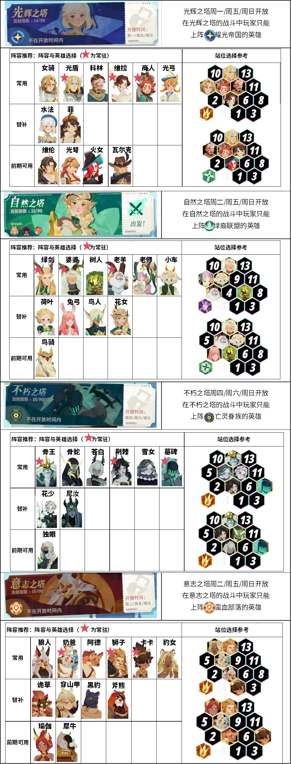 天穹试炼在四座巨塔中举行,分别是:光辉之塔、意志之塔、自然之塔、不朽之塔。在光辉之塔的战斗中,玩家只能上阵耀光帝国的英雄;在意志之塔的战斗中,玩家只能上阵蛮血部落的英雄;在自然之塔的战斗中,玩家只能上阵绿裔联盟的英雄;在不朽之塔的战斗中,玩家只能上阵亡灵眷族的英雄。通关试炼可以获得海量资源。