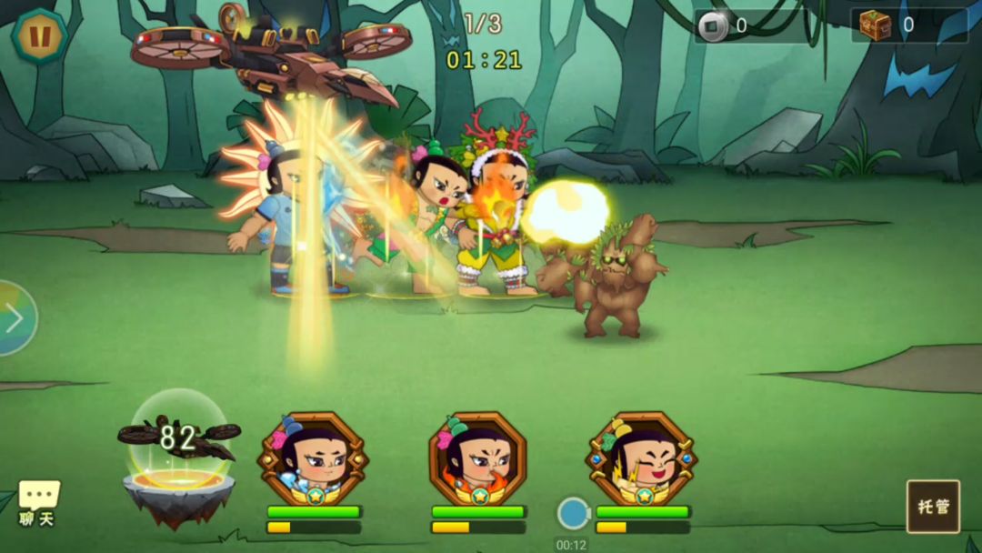 进去托管開启空警02,三娃能量满立即用技能保护血量,普攻过关。