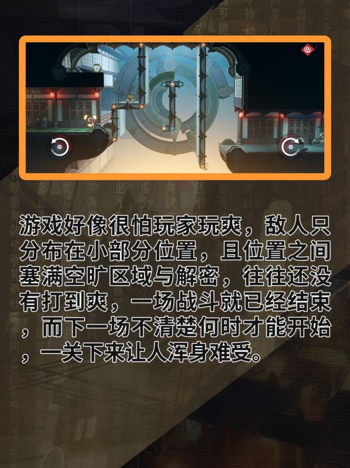 至于动作内容,动作系统问题不大,有合适的动作节奏,炫酷的技能特效,但游戏好像很怕玩家玩爽,敌人只占据小部分位置,且位置之间塞满解密与空旷区域,往往还没有打到爽,一场战斗就已经结束,而下一场不清楚何时才能开始,一关下来让人浑身难受。