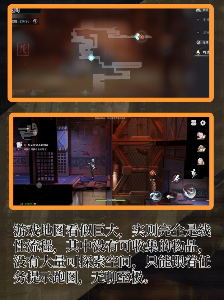 游戏横板地图看似巨大,实则完全是线性流程,没有可收集的物品,没有大量可探索空间,只能跟着任务提示跑图,无聊至极。