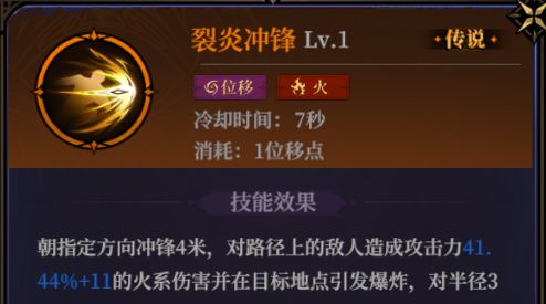 裂炎冲锋:少有的火系位移伤害法术,位移过程能造成伤害且有较长的无敌时间,升阶后能额外造成伤害,还能提升法术伤害,而且高阶下还能减少法术冷却时间。