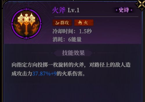 火斧:火系的指定方向直行性伤害法术,拥有能让战士远程攻击能力的法术,升阶后不仅能额外造成伤害,还能增加给敌人上debuff的能力,而且冷却时间很短,在心得槽上几乎可以做到无缝衔接。