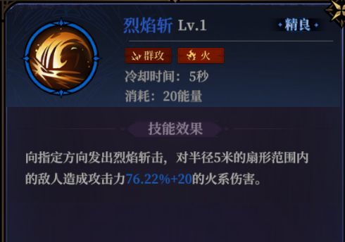烈焰斩:火系的指定方向范围伤害法术,拥有较大的伤害范围,升阶后不仅增加给敌人上debuff的效果,还会提升法术伤害,初期较为好用的法术。
