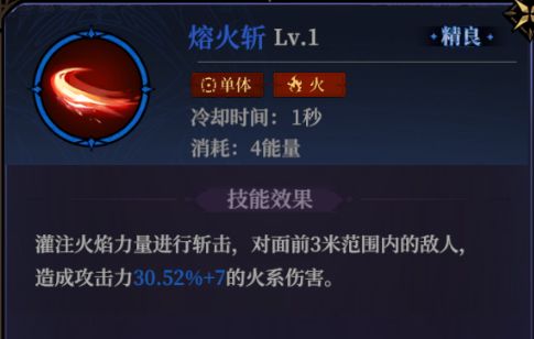 熔火斩:火系的小范围伤害法术,升阶后不仅能增加额外造成伤害的刀光扩大攻击范围,还能增加给敌人上debuff的效果,而且冷却时间极短,在心得槽上可以做到无缝衔接。