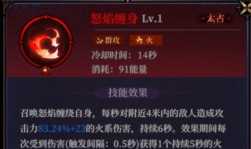 怒焰缠身:火系的持续性范围伤害法术,且拥有一定的火系暴击率增益,升阶后不仅增加自身火系暴击率增益,还能给自己施加额外buff,且高阶能增加给敌人上debuff的能力,暴力且全面。