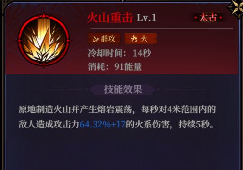 火山重击:火系的范围伤害法术,升阶后的效果不仅能额外增加范围跟伤害,还能增加给敌人上debuff的能力,高阶还能造成眩晕效果,极为强大。