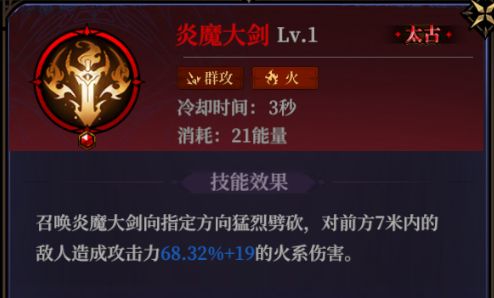 炎魔大剑:火系的直线范围伤害法术,简单纯粹且暴力,升阶后不仅拥有持续范围伤害,还会提升对有火系debuff的敌人的伤害效果,高阶增加对敌人上debuff的能力,且冷却时间较短,置于心得槽上仅有2秒。