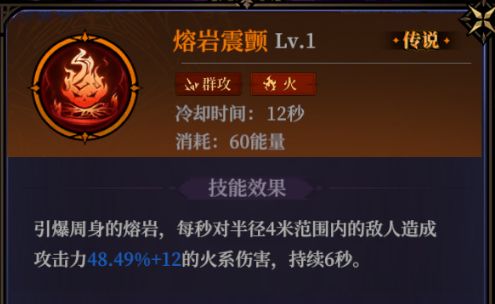 熔岩震颤:火系的持续性随身范围伤害法术,升阶后能增加给敌人上debuff的能力且概率较高,还能提升法术伤害,高阶还能增加击杀敌人的小范围爆炸伤害。