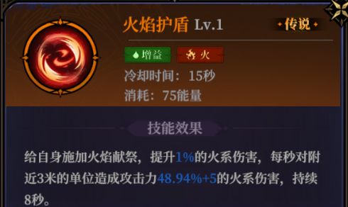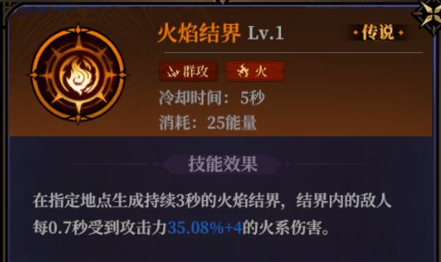 火焰结界:持续性指定范围伤害法术,升阶后不仅能增加给敌人上debuff的效果,还会延长持续时间,高阶能延长到4.5秒,本身冷却时间5秒,实际伤害间隔冷却能做到仅0.5秒。