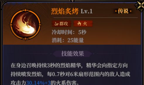烈焰炙烤:召唤烈焰的持续性范围伤害法术,升阶后增加法术的伤害频次,还能增加给敌人上debuff的效果。