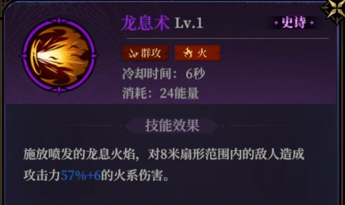 龙息术:火系的扇形范围伤害法术,覆盖范围上不错,升阶后不仅有强制击退效果,还能增加给敌人上debuff的效果,高阶还可以给自己施加buff,冷却时间也不长。