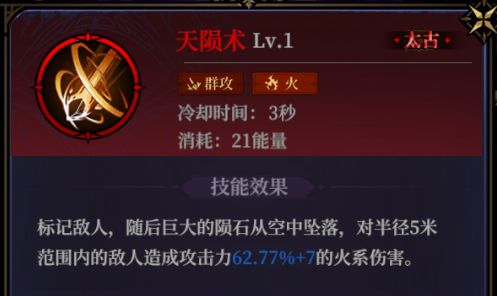 天陨术:范围性伤害技能,效果单一造就的强大,升阶后的效果也是极致的增加伤害,高阶增加给敌人上debuff的效果,而且冷却时间很短。(属实写满了火系的爆裂美学)