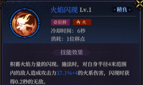 火焰闪现:少有的火系位移技能,使用期间造成伤害且有短暂的无敌时间,升阶后不仅能增加给敌人上debuff的效果,还能缩短本就短暂的冷却时间,规避伤害时很好用。