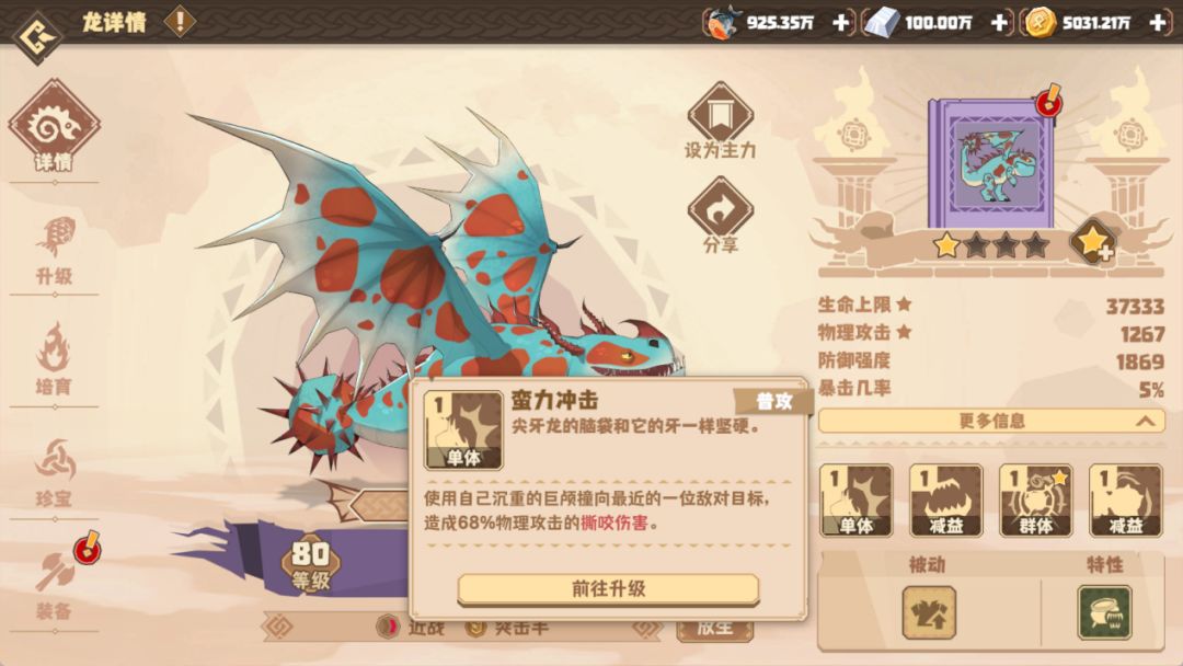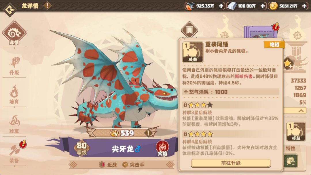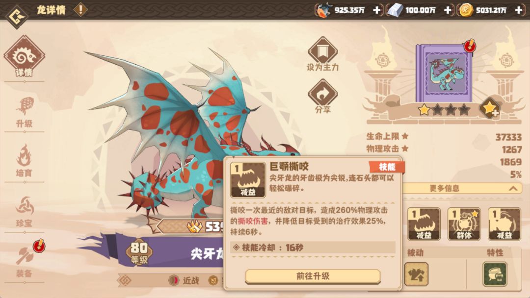 种群4星后激活获得被动技能【利齿震慑】,尖牙龙在场时敌方全体目标奇袭几率降低10%。