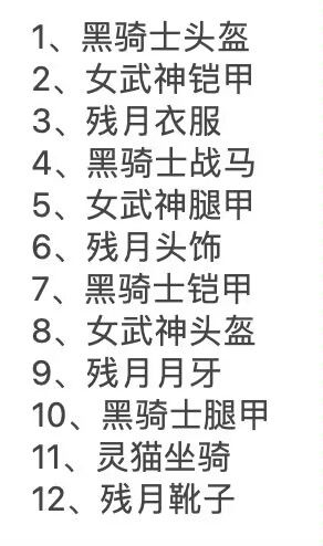 优先购买:灵猫坐骑,黑骑士战马(选一个,推荐选猫,因为比较可爱。),女武神下装。