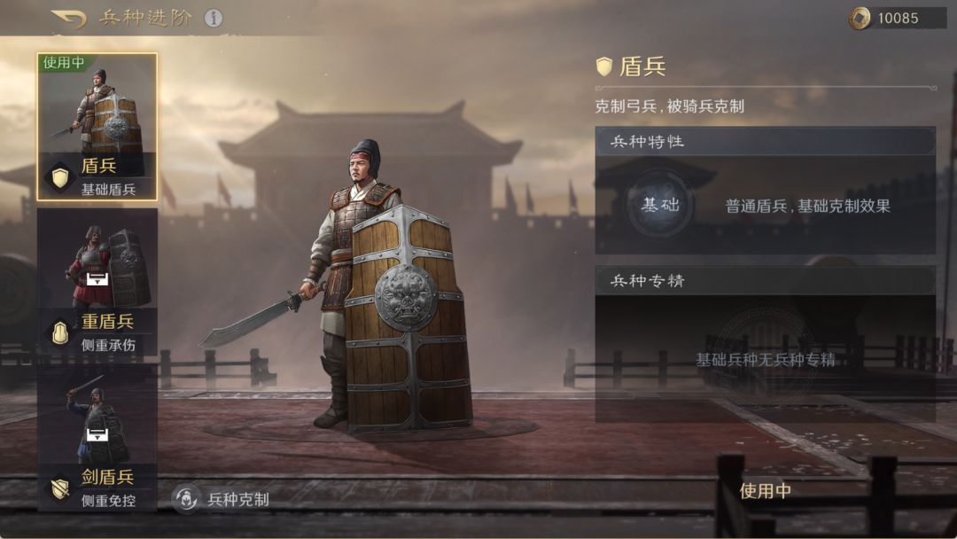 兵种进阶一共分为四大类:盾兵、枪兵、骑兵和弓兵。每个兵种进阶过后都会有不同的兵种特性和兵种专精。