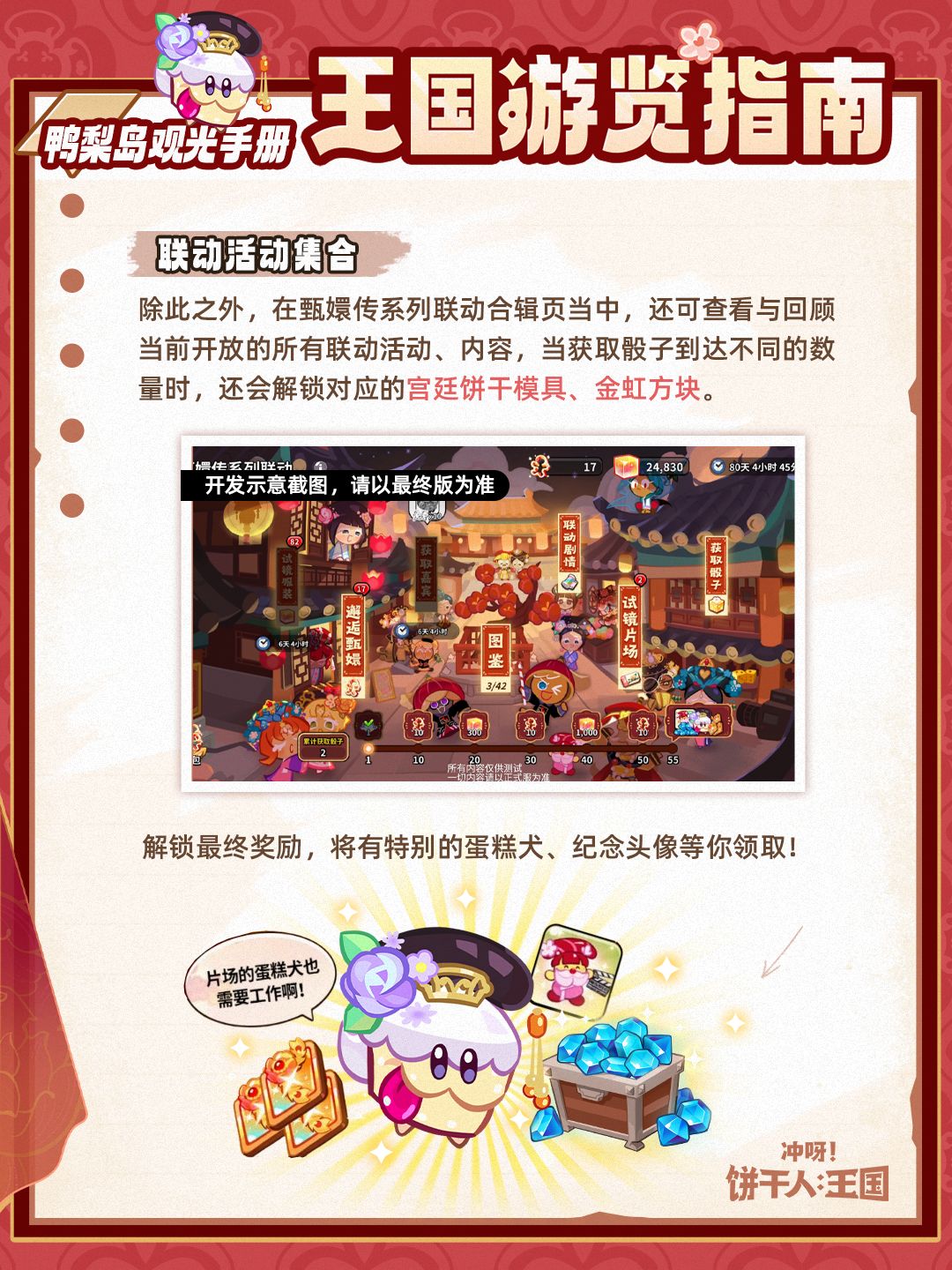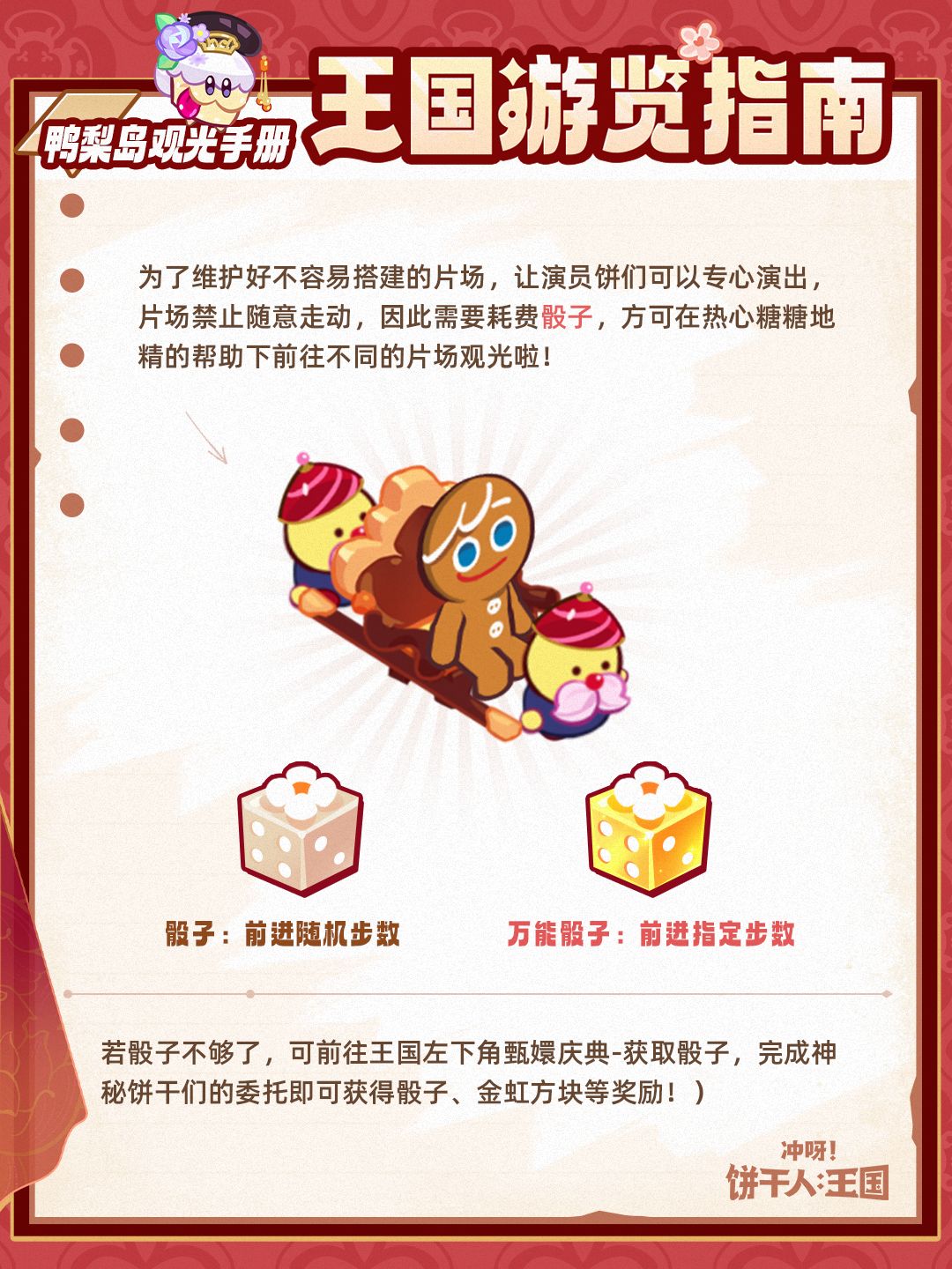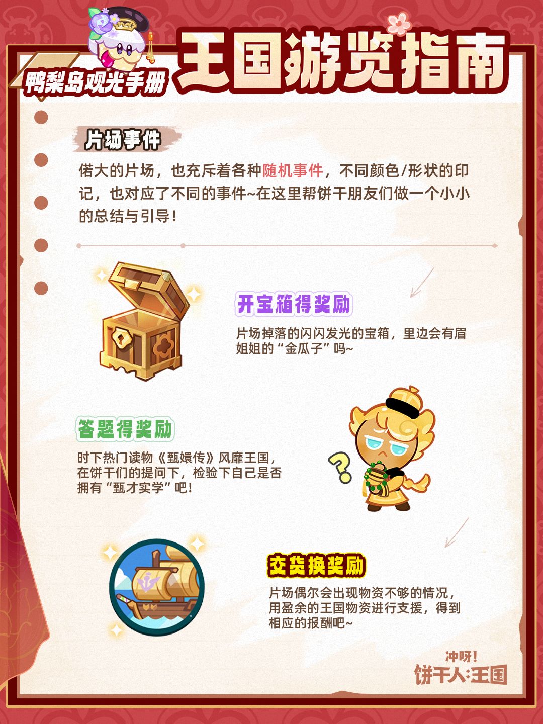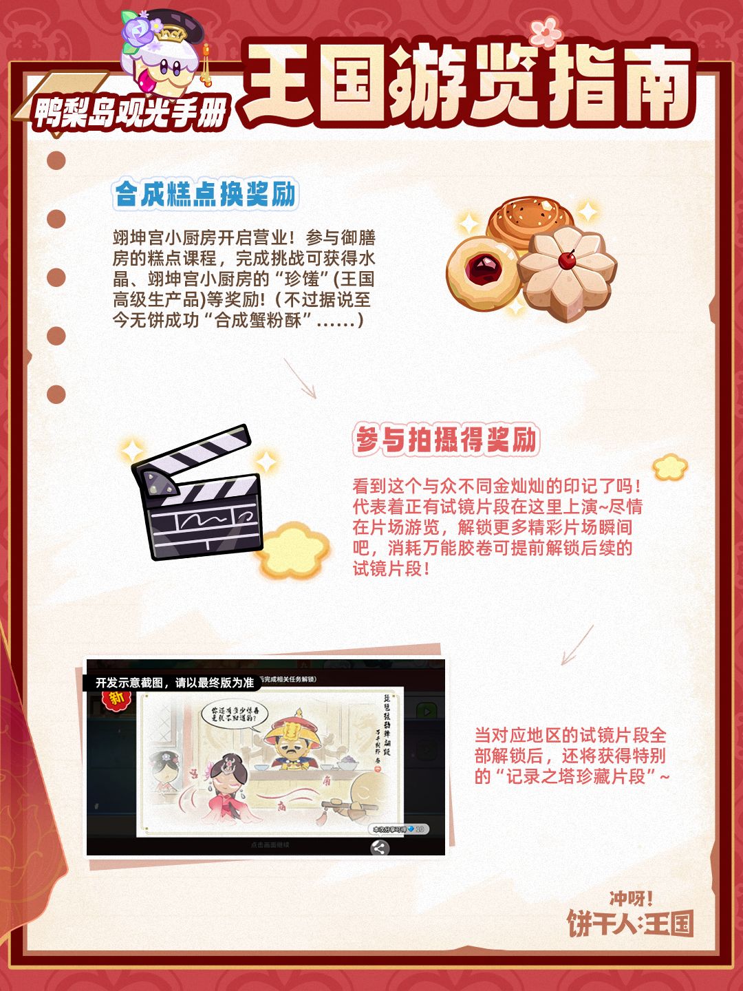 鸭梨岛片场限时开放!来试镜的饼干朋友们通过消耗指定片场道具,就可以在此阅读剧本进行试镜、练习某项神秘的糕点工艺等等……在片场到处走走,就能遇到不同的事件。快来勇闯清凉鸭梨岛,解锁甜蜜试镜机遇吧!