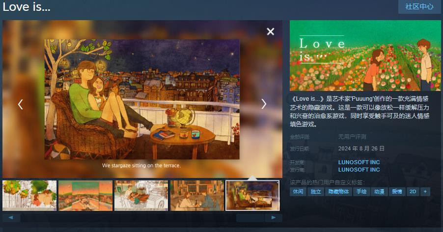 今日(8月6日),手绘插画情感艺术隐藏物品游戏《Love is...》Steam页面上线,游戏支持简繁体中文,预计于8月26日发售,感兴趣的玩家可以点击此处进入商店页面。