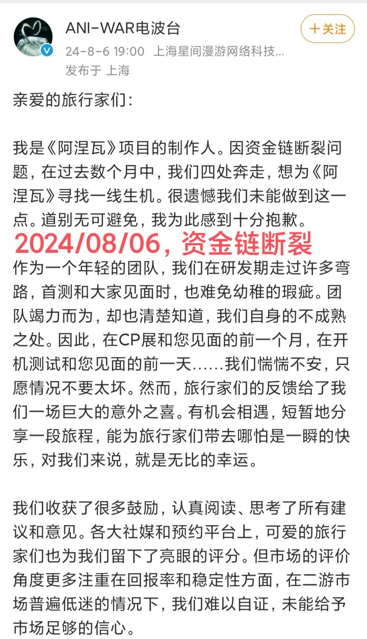 存活两年半的二游《阿涅瓦》,被终止研发❗❗