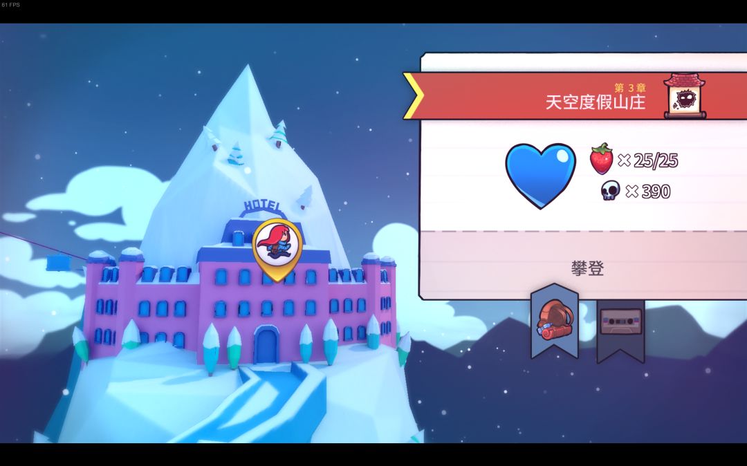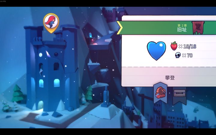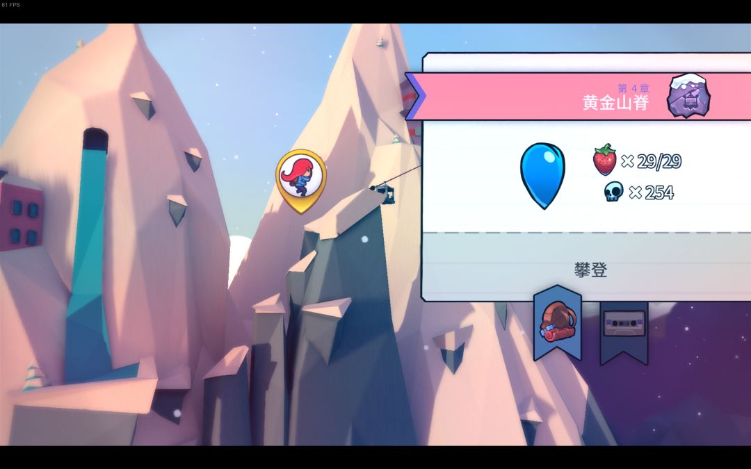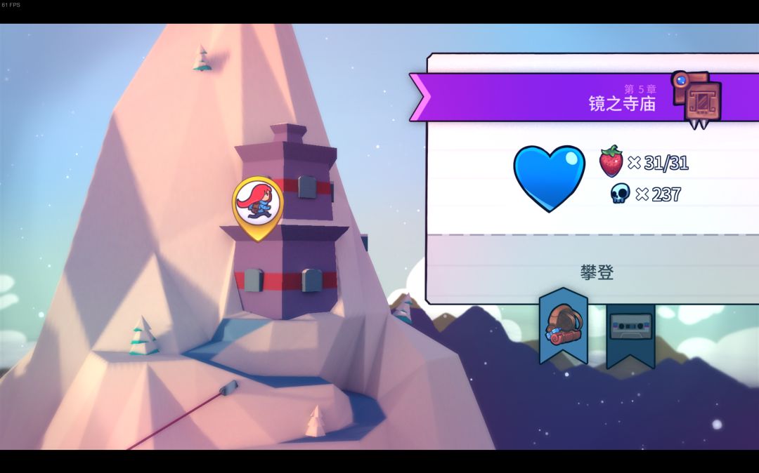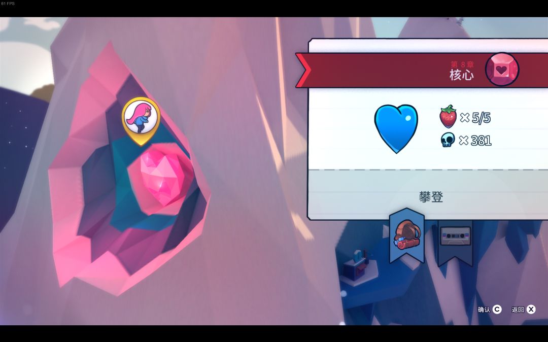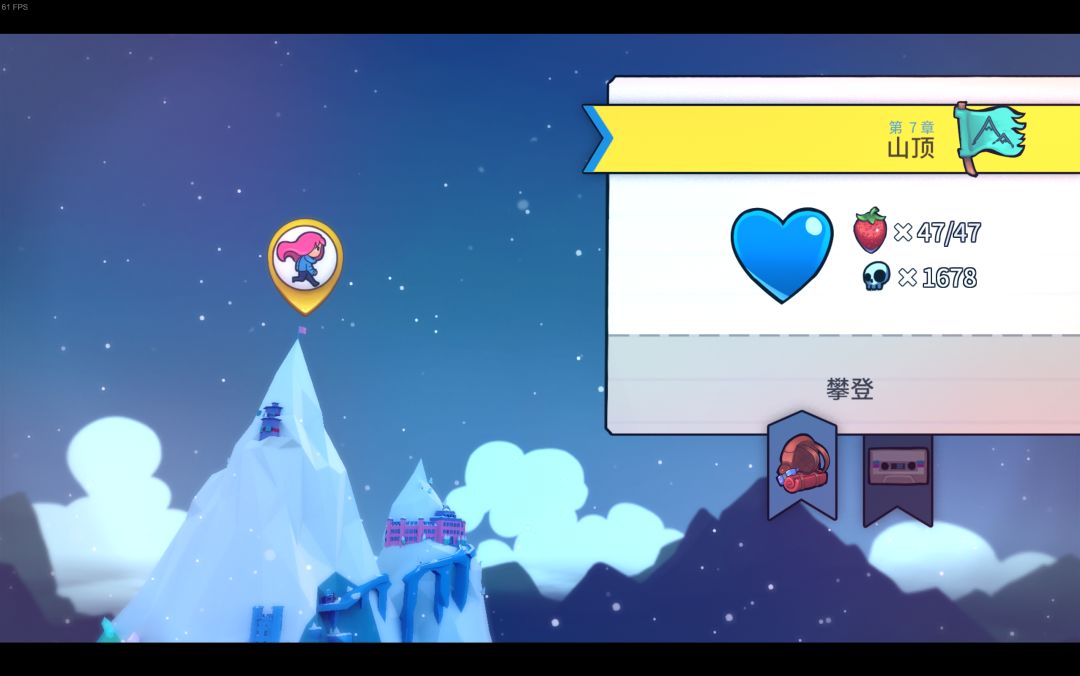蔚蓝a面的前八关通关途中可以收集草莓,普通草莓一共175个;通过b面后,会出现金草莓,不管那个面,每关的开头都会有一个金草莓,带着金草莓一次都不死通关就能得到金草莓,金草莓一共有25个;还有一个飞金草莓,在第一关的最后,需要第一关不用冲刺通关,才可以获得;第九关还有一个月莓,意思就是月亮上的草莓。总共202个。关于草莓的梗有个“草莓没馅”,你收集的草莓会在终章做成馅饼,和朋友一块吃,但是途中要是不收集草莓就只有馅饼,没有草莓。