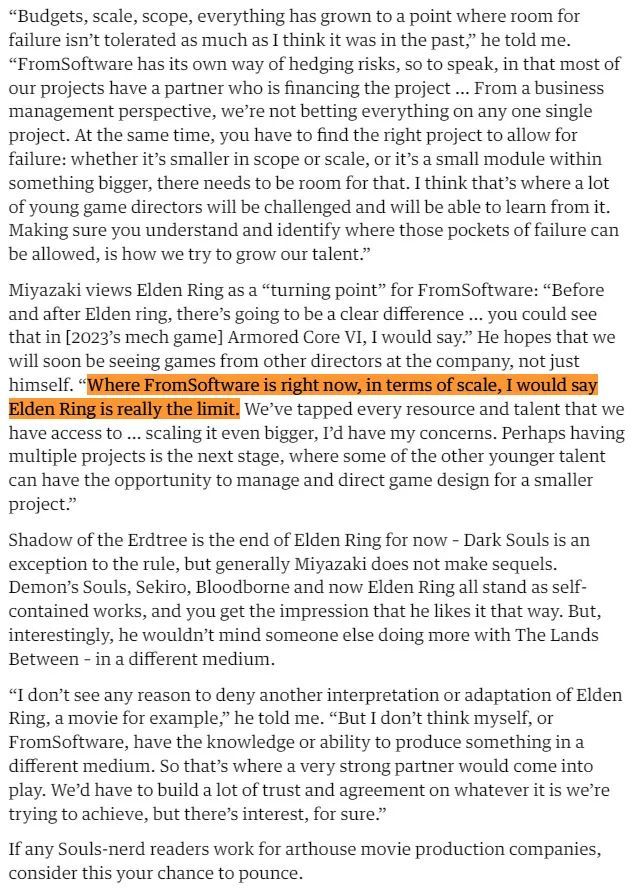 宫崎英高认为《艾尔登法环》是FromSoftware的一个“转折点”:“在《艾尔登法环》之前和之后,会有一个明显的区别……我认为你可以在2023年的机甲游戏《装甲核心6》中看到这一点。” 他希望我们很快就能看到公司其他导演制作的游戏,而不仅仅是他自己。“就FromSoftware目前的规模来说,我认为《艾尔登法环》确实已经是极限了。我们已经用尽了所有可以接触到的资源和人才……如果规模再大一些,情况可能会不妙。或许有多个项目是下一个阶段,让一些年轻人才有机会管理和设计一个较小的项目。”