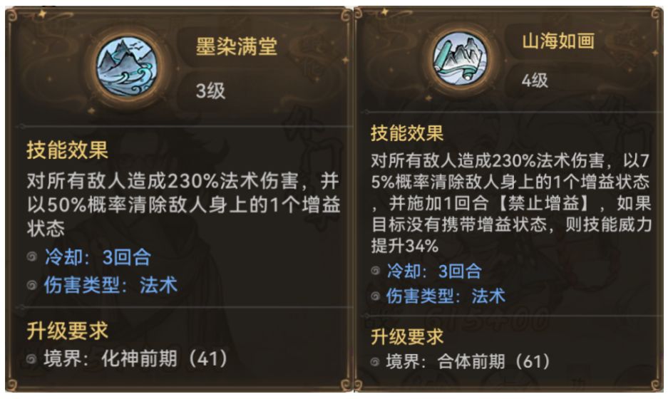 职业特色:普通画师的技能只有祛除增益,只有在天命【墨华】的加持下才能达到【禁止增益】的效果,但画师的被动【妙笔生花】能非常好补足了效果命中,同时也能让画师选择【扇】武器而非【笔】去和舞姬争一速。