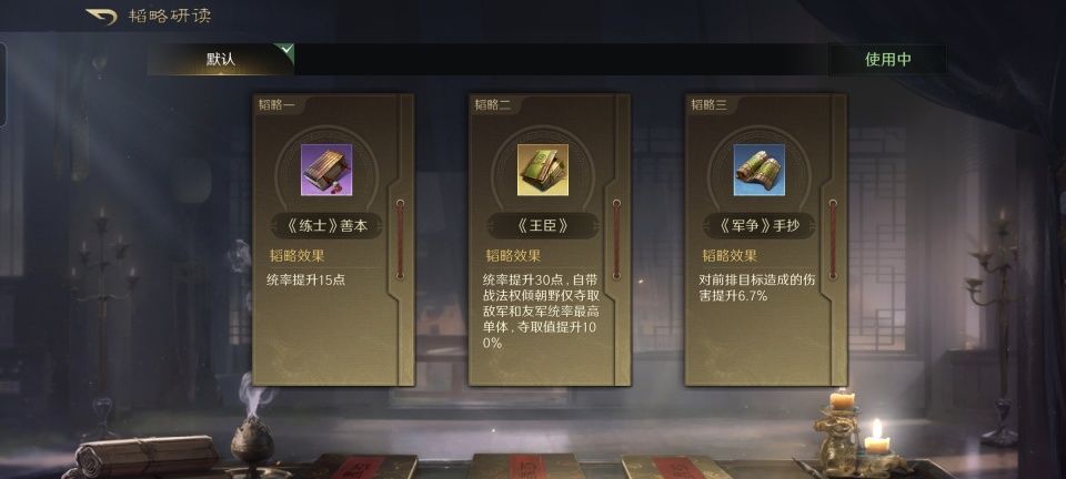 曹操躲到后排去也好,毕竟乱世奸雄本身就是个优质的小强战法,再加上第二战法清风驱疾的效果,他就能更加周全的保护袁绍和董卓。第三战法指点乾坤,依旧主要是为了增强董卓的进攻,兵刃伤害将占到全场输出的大头。至于韬略库,则由先战善本、威帅手抄和临峰善本构成,看来曹操对袁绍还是有情的,还记着给他减伤了4%。