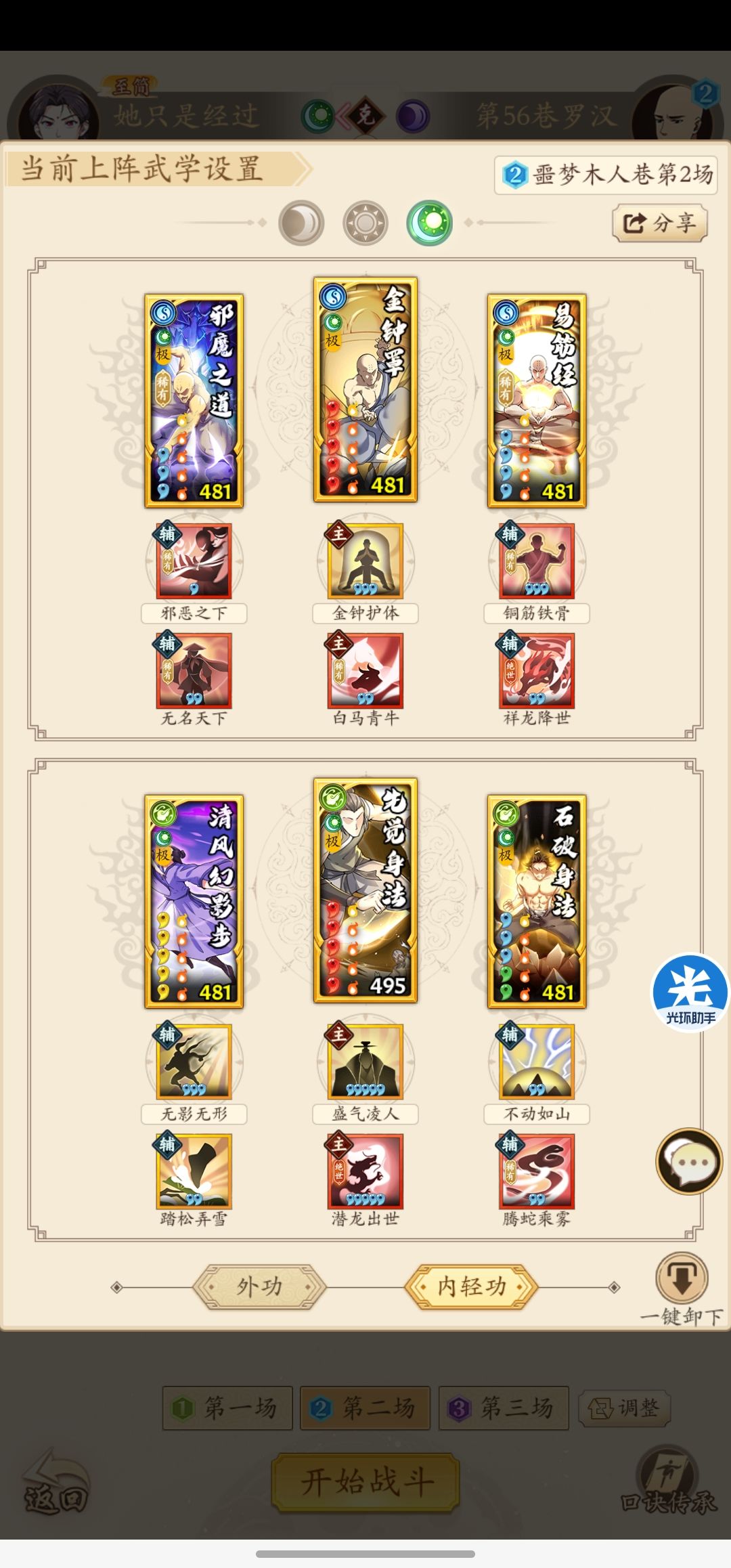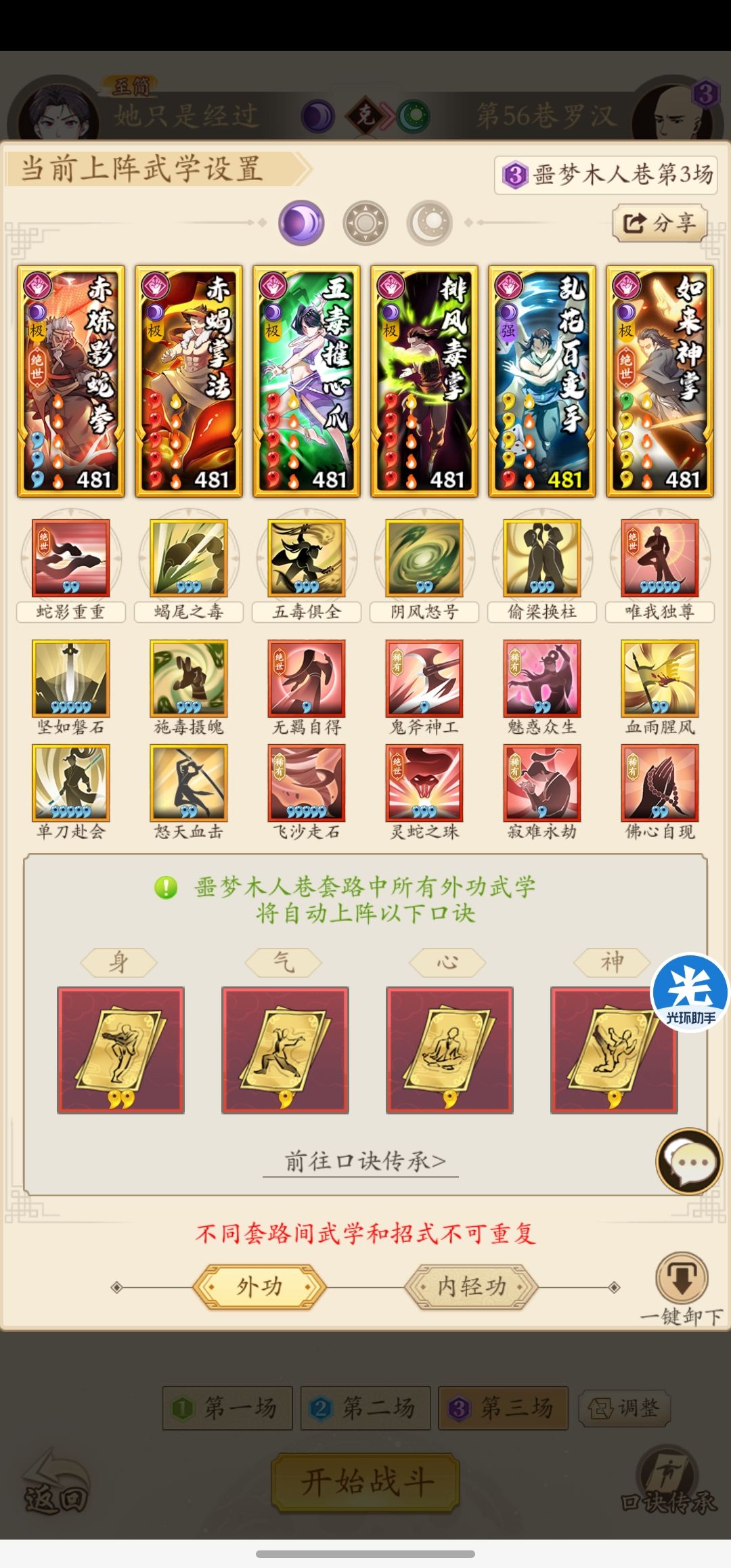 总的来说,这一层挺有意思的。第一关对面是个半吊子吸内,所以我们也上吸内,凹一凹也能过。第二关对面比较厉害,所以我的思路是猛堆四系减伤,效果感觉很好。尤其是欲穷千里,化险为夷,旗开得胜这三个招式,搭配上气海刀法的四系减伤,基本上对面打你不怎么痛。第三关相对轻松,毒爆一出对面基本就没了,第三关强烈建议将血雨腥风换成感怀今夕