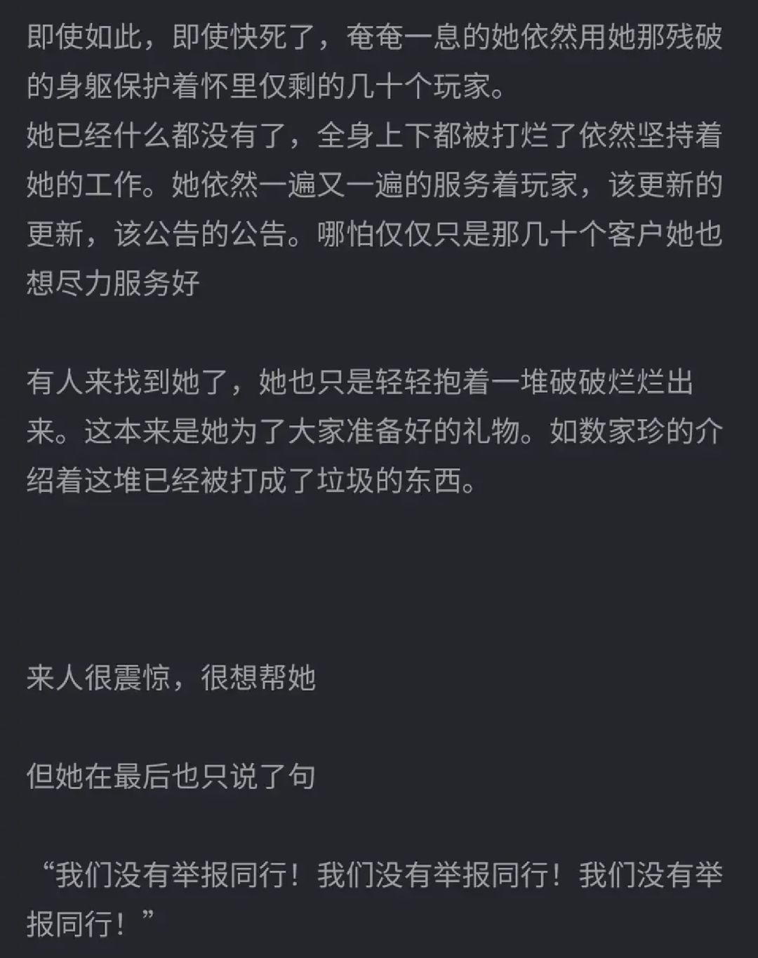 等到一轮轮攻击过去,终于有理智玩家开始注意到拂晓遭受的无妄之灾时候。拂晓已是奄奄一息,但还是为了最后留存的几十个玩家尽了心力。说到还在坚持的理由,制作人的话也很朴实,毕竟是投入了几年心血的孩子也舍不得就这么让她离开,比起稍微不赚钱就关服,拂晓和久游相当有人情味了。