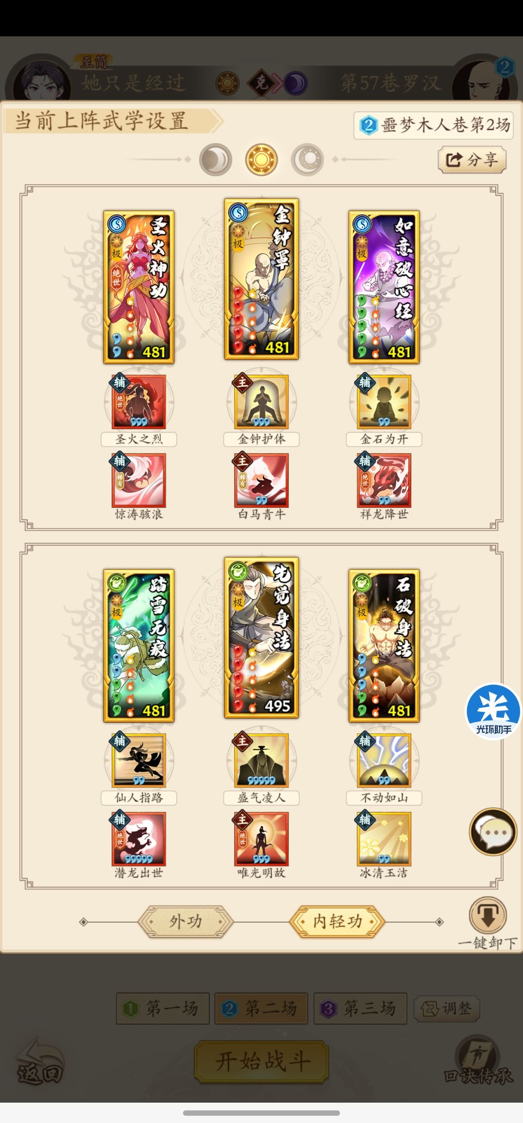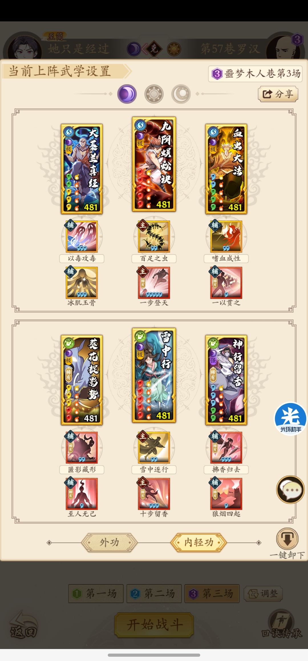 没啥好说的,传统的三套。如果第三关阴拳练度不高,可以参考之前帖子的回血流阴剑。只是使用阴间时,第二关5号位和6号位就需要换成两个奇门招式,这里推荐奉先枪法和无常鞭法。