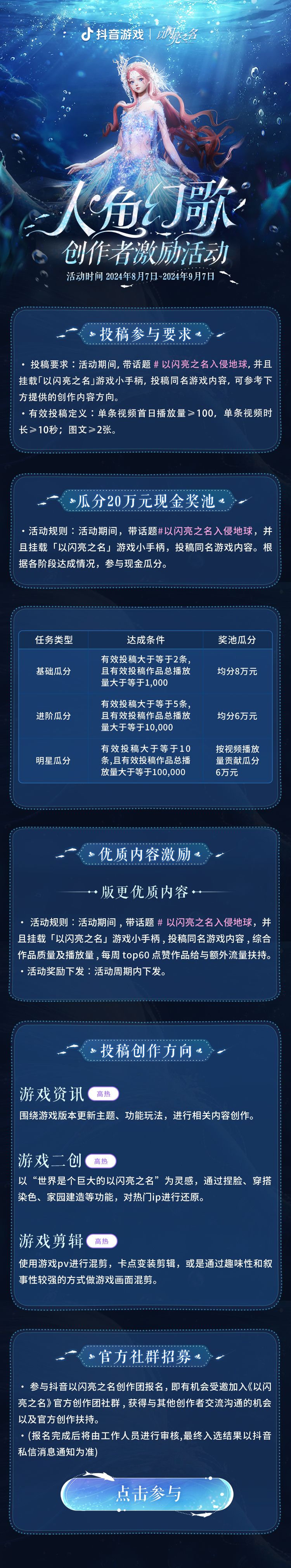 更多活动细则,请戳图或进入抖音以闪亮之名人鱼幻歌创作者激励活动页了解。