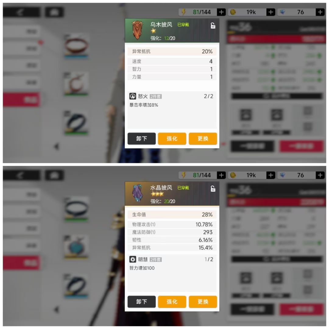 装备同样是需要去刷的,但跟传统卡牌不一样是有等级限制的,等级不够就穿不了,不是1-10级,是11、12、13、14分开的等级限制。并且同样的等级,主属性、副属性都会天壤之别。一张图就一目了然。可以看到主副属性的差距明显,且同样的级别数值不一样。并且副词条的附加属性有多达15种。强化经验全返,金币不返,有待开发,不然消耗太大了。